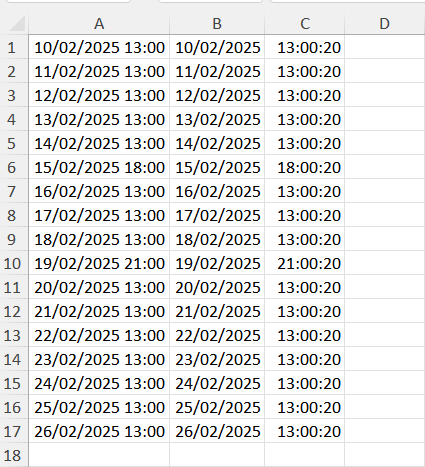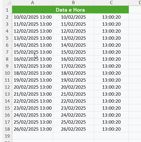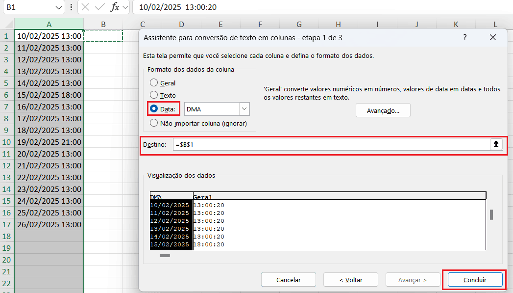 - Clique em Concluir, e pronto! Agora a data e a hora estarão em colunas separadas.