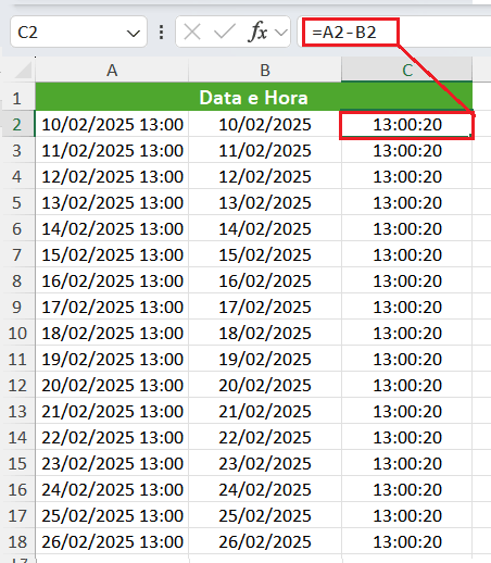 3. Separando a hora na coluna C