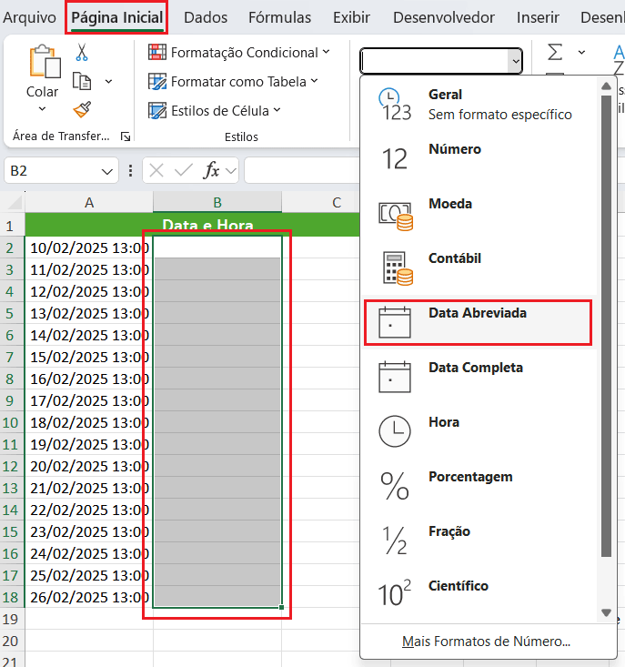 - Vá até a guia Página Inicial e, em Formato de Número, escolha Data Abreviada.