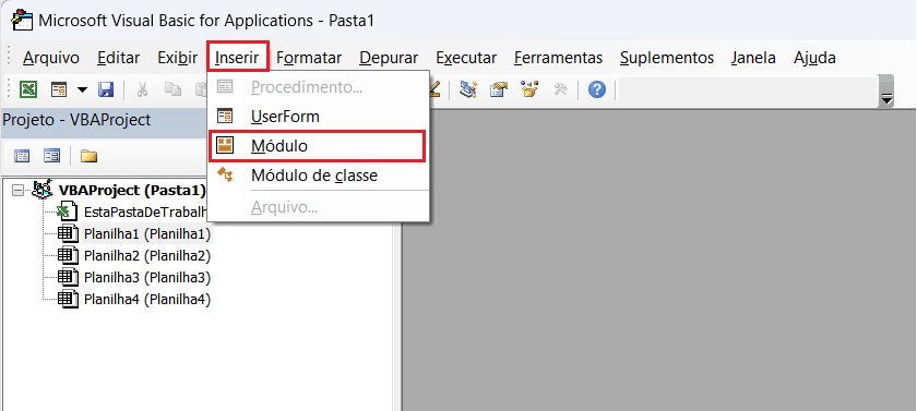 2. Na janela do Visual Basic, vá até a guia Inserir e selecione Módulo: