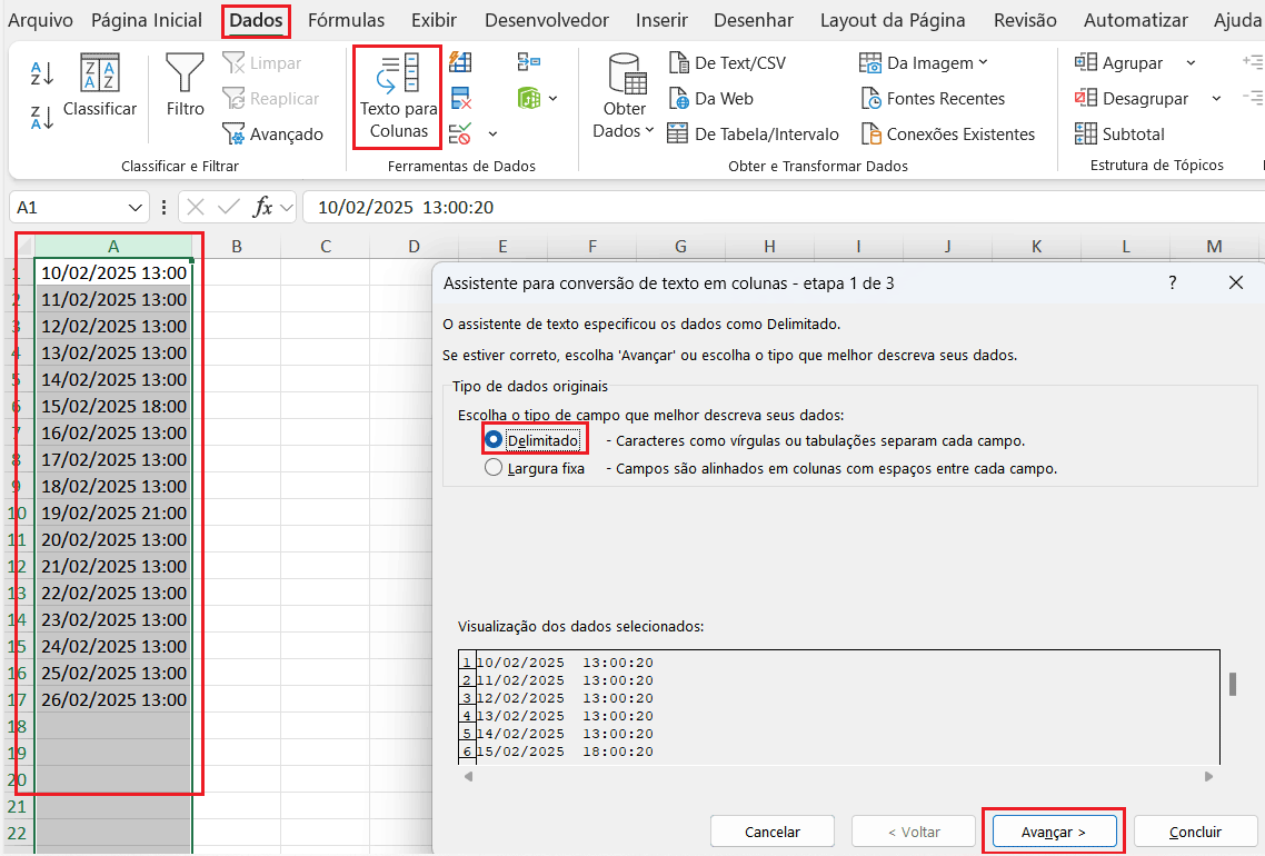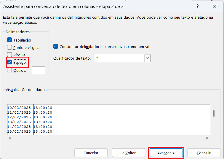 - Marque a opção Espaço como delimitador (pois a data e a hora estão separadas por um espaço).