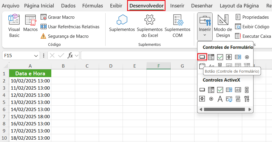 4. Feche a janela do VBA. Acesse novamente a guia Desenvolvedor e selecione Inserir > Botão: