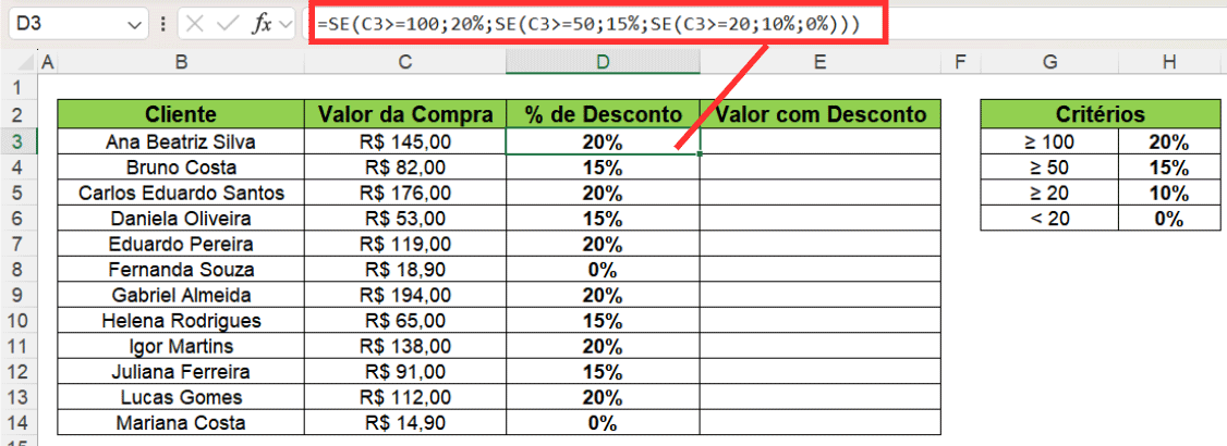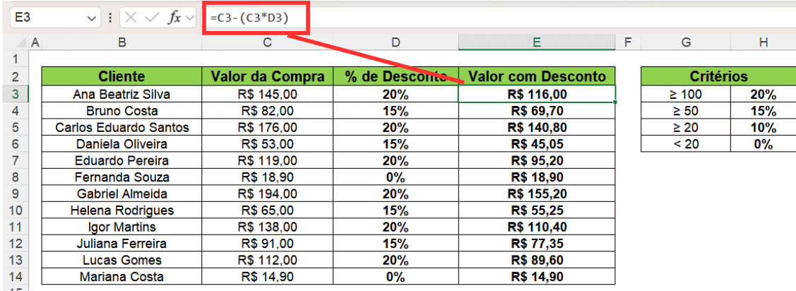 Na terceira coluna, precisamos calcular o percentual de desconto seguindo a regra.