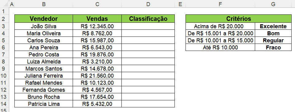 Neste primeiro exemplo de uso da função SE com 4 condições, observe que temos uma lista de vendedores e suas respectivas vendas. Na terceira coluna, precisamos obter a classificação do desempenho de cada vendedor com base em suas vendas.