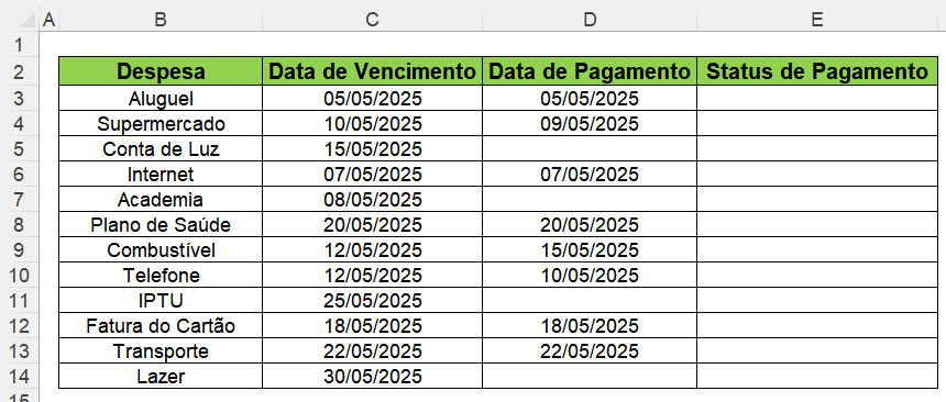 Para melhor compreensão, observe no exemplo abaixo no qual temos uma tabela para controle de despesas contendo o nome da despesa na primeira coluna, a Data de Vencimento na segunda coluna e a Data de Pagamento na Terceira coluna.