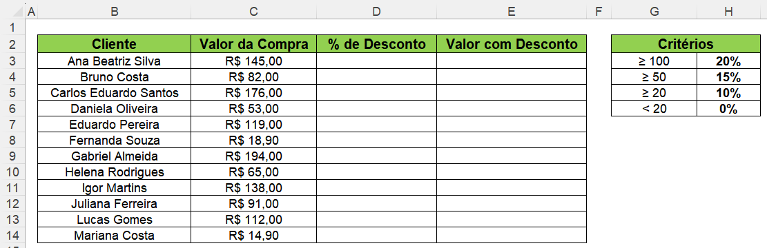 Para melhor compreensão, observe o exemplo abaixo, no qual temos os nomes de alguns clientes na primeira coluna e o valor de suas compras na segunda coluna.