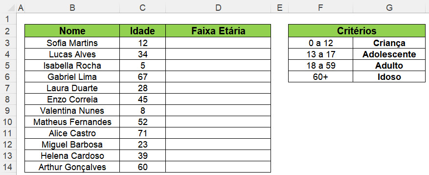Neste segundo exemplo, temos uma tabela contendo o nome de algumas pessoas e suas respectivas idades. Deste modo, precisamos calcular a faixa etária de cada pessoa com base nos critérios: