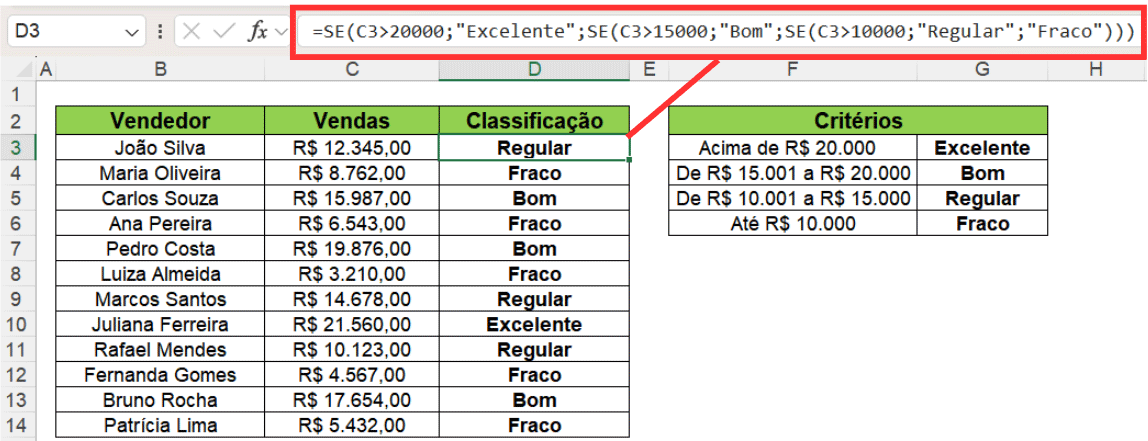 =SE(C3>20000;"Excelente";SE(C3>15000;"Bom";SE(C3>10000;"Regular";"Fraco")))