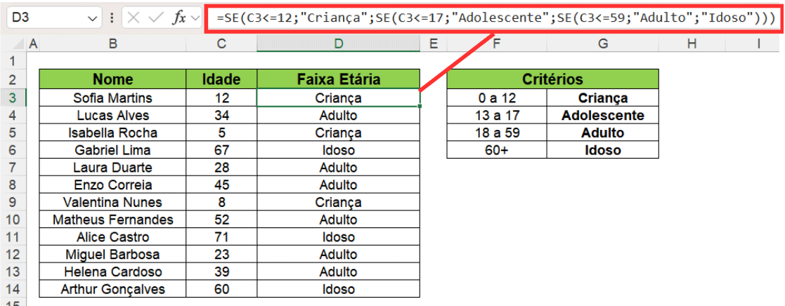 =SE(C3<=12;"Criança";SE(C3<=17;"Adolescente";SE(C3<=59;"Adulto";"Idoso")))