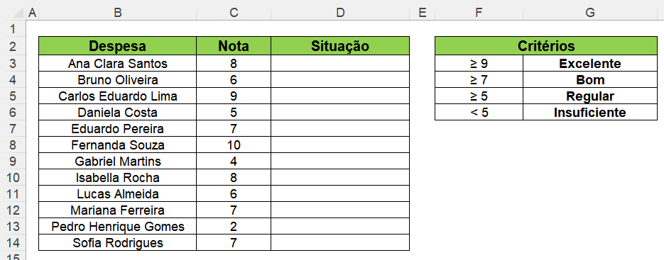 No exemplo abaixo, temos uma tabela contendo o nome de alguns alunos e suas respectivas notas. Na terceira coluna, precisamos obter a situação de acordo com a nota do aluno, obedecendo aos seguintes critérios.