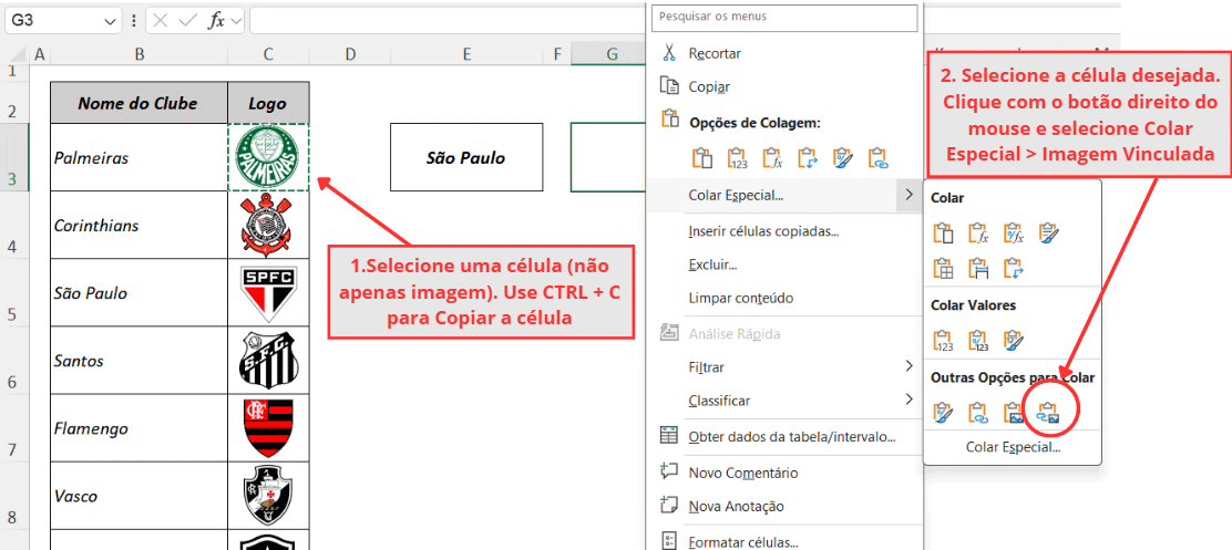 Menu Colar Especial com a opção Imagem Vinculada no Excel