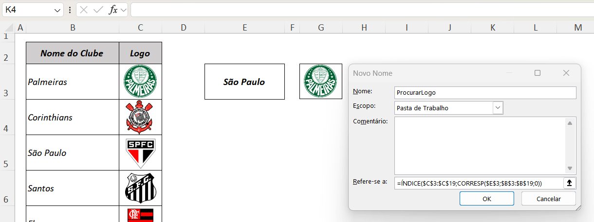 • ÍNDICE($C$3:$C$19;…posição…): A função ÍNDICE recebe a posição retornada pelo CORRESP e, dentro do intervalo das imagens (C3:C19), ela retorna a referência da célula que está nessa posição. No nosso exemplo, ela retornaria a referência da célula C3, que contém o escudo do Palmeiras.