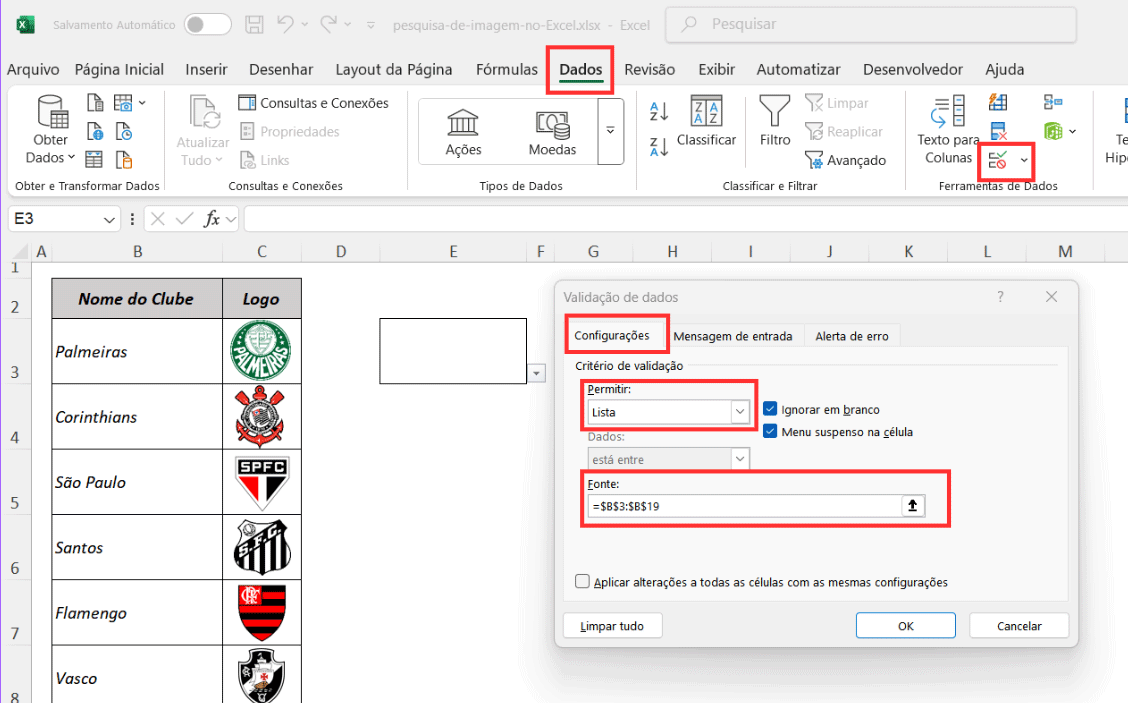 4. No campo Fonte, selecione o intervalo que contém os nomes dos clubes (B3:B19, no nosso exemplo). Clique em OK.