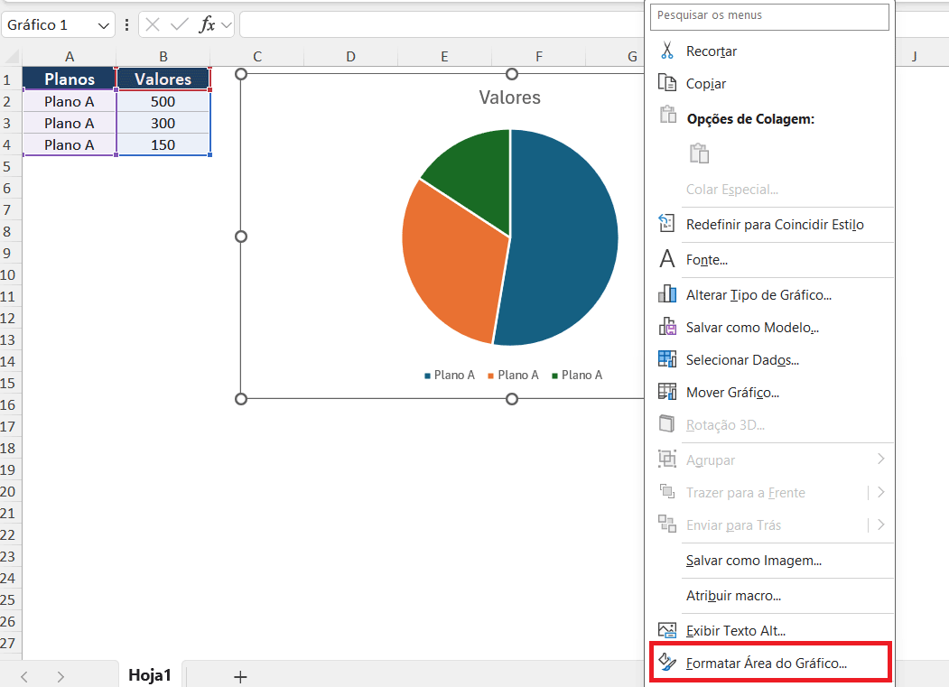 Passo 2: Clique com o botão direito sobre a área do gráfico criado e escolha a opção: Formatar Área do Gráfico.