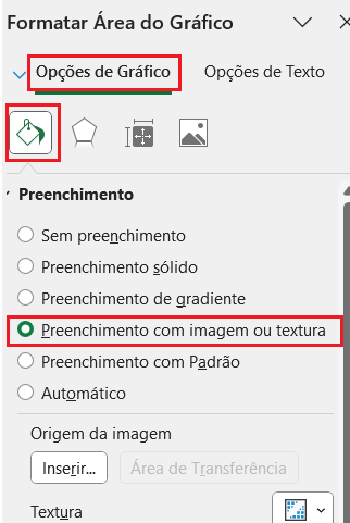 Passo 3: Será aberta a janela para formatar área do gráfico. Em Opções de Gráfico, selecione Preenchimento > Preenchimento com imagem ou textura: