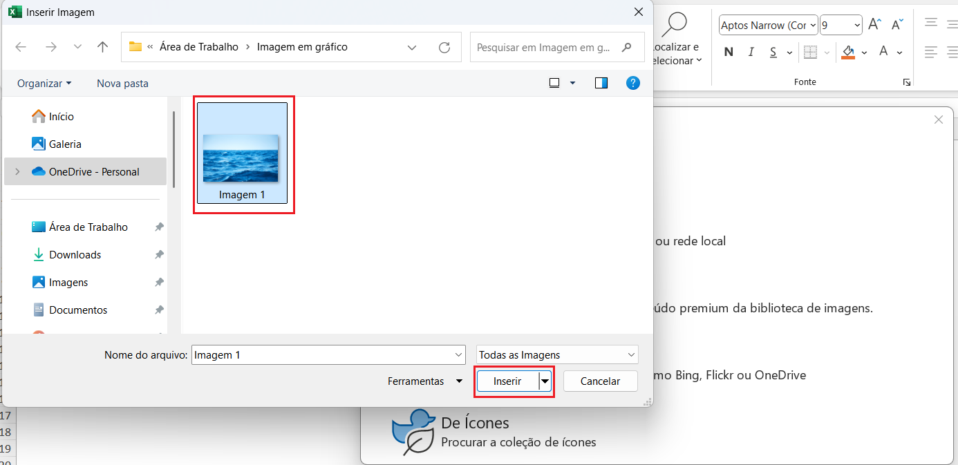 Passo 5: Agora, basta selecionar o local onde encontra-se a imagem, selecioná-la e clicar em Inserir: