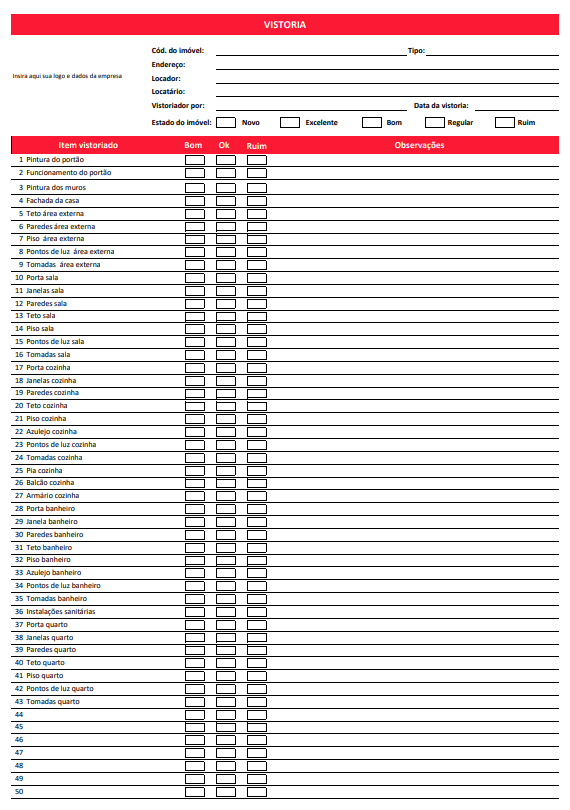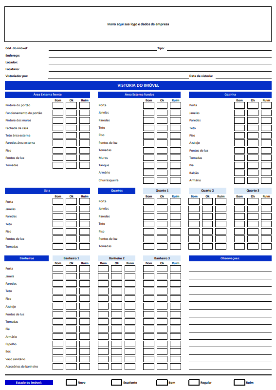 Neste primeiro modelo de vistoria de imóvel, temos um checklist separado por cômodos, onde o responsável pela vistoria deverá marcar cada item, informando se o item está Bom, Ok ou Ruim.