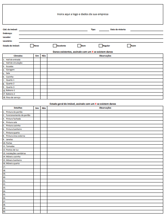 Este modelo conta com os principais itens que normalmente são vistoriados. Nele, deverão ser preenchidos os dados como: cabeçalho com as informações sobre o imóvel, locador, locatário, data da vistoria, responsável pela vistoria e assinalar com um X no campo “Estado do imóvel“. Do lado esquerdo, no canto superior, também há um espaço para inserir a logo ou informações da sua empresa.