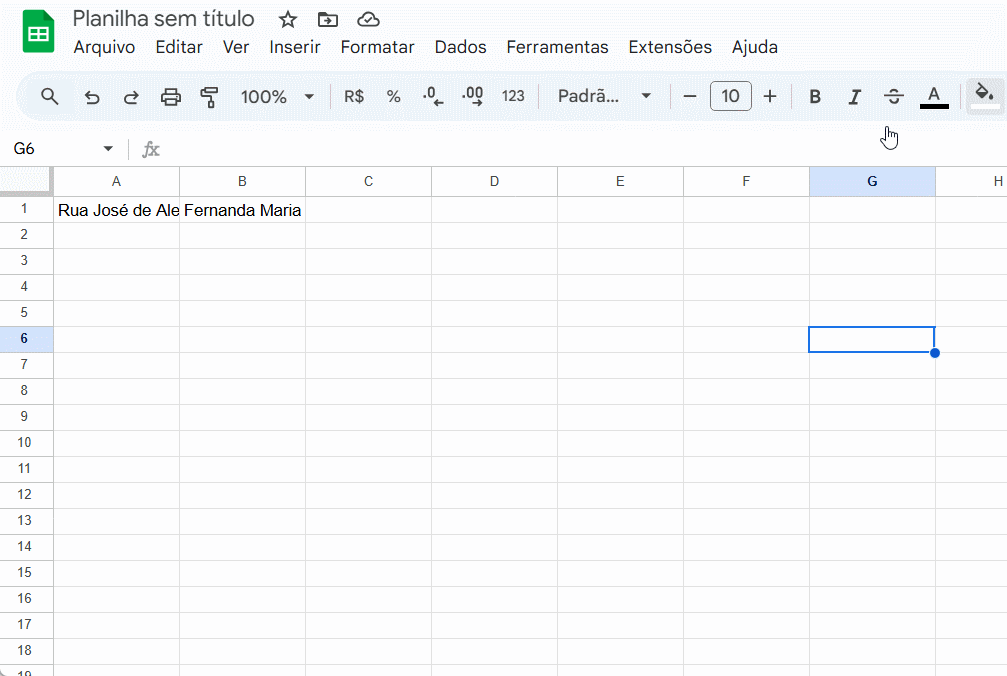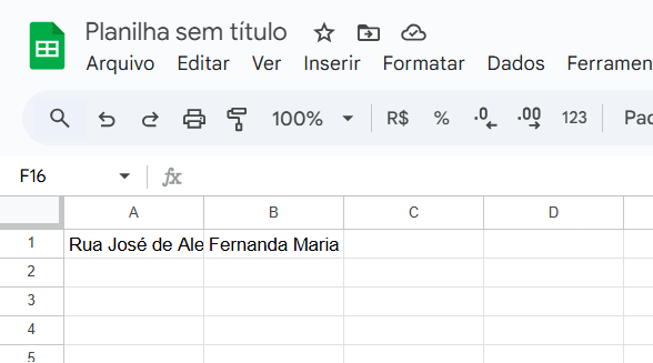 Na imagem abaixo, o endereço na célula A1 está sobrepondo a célula B1. Se houvesse um nome em B1 (como “Fernanda Maria”), o texto ficaria parcialmente oculto:
