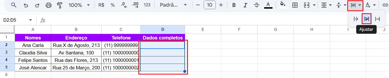 1. Selecione as células em branco da coluna D que receberão os dados concatenados. Em seguida, acesse a opção Ajustar: