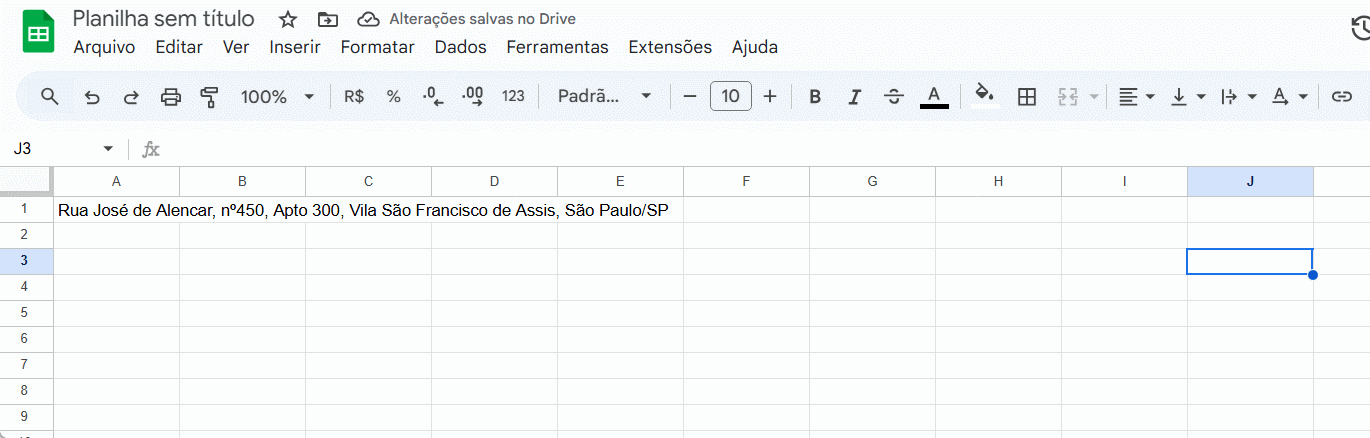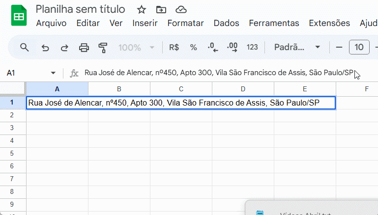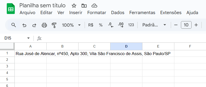 Essa é a opção mais simples e prática para quebrar texto rapidamente. Tanto o Excel quanto o Google Planilhas possuem essa ferramenta. Veja o exemplo abaixo, onde um endereço ocupa várias células: