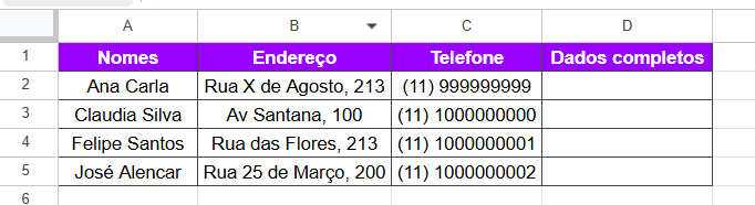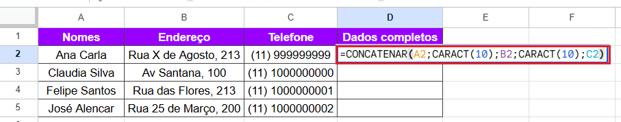 - A função CONCATENAR é usada para juntar o conteúdo de diferentes células em uma única célula. No exemplo, unimos o nome, endereço e telefone.